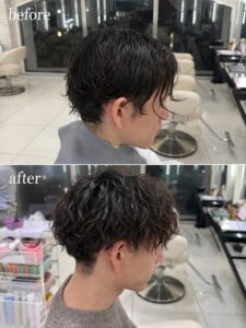 トップには緩めのシャドウパーマをプラス。強すぎないカールなので、社会人の方や就活生、校則が気になる学生さんでも挑戦しやすい、好印象なメンズスタイルです。